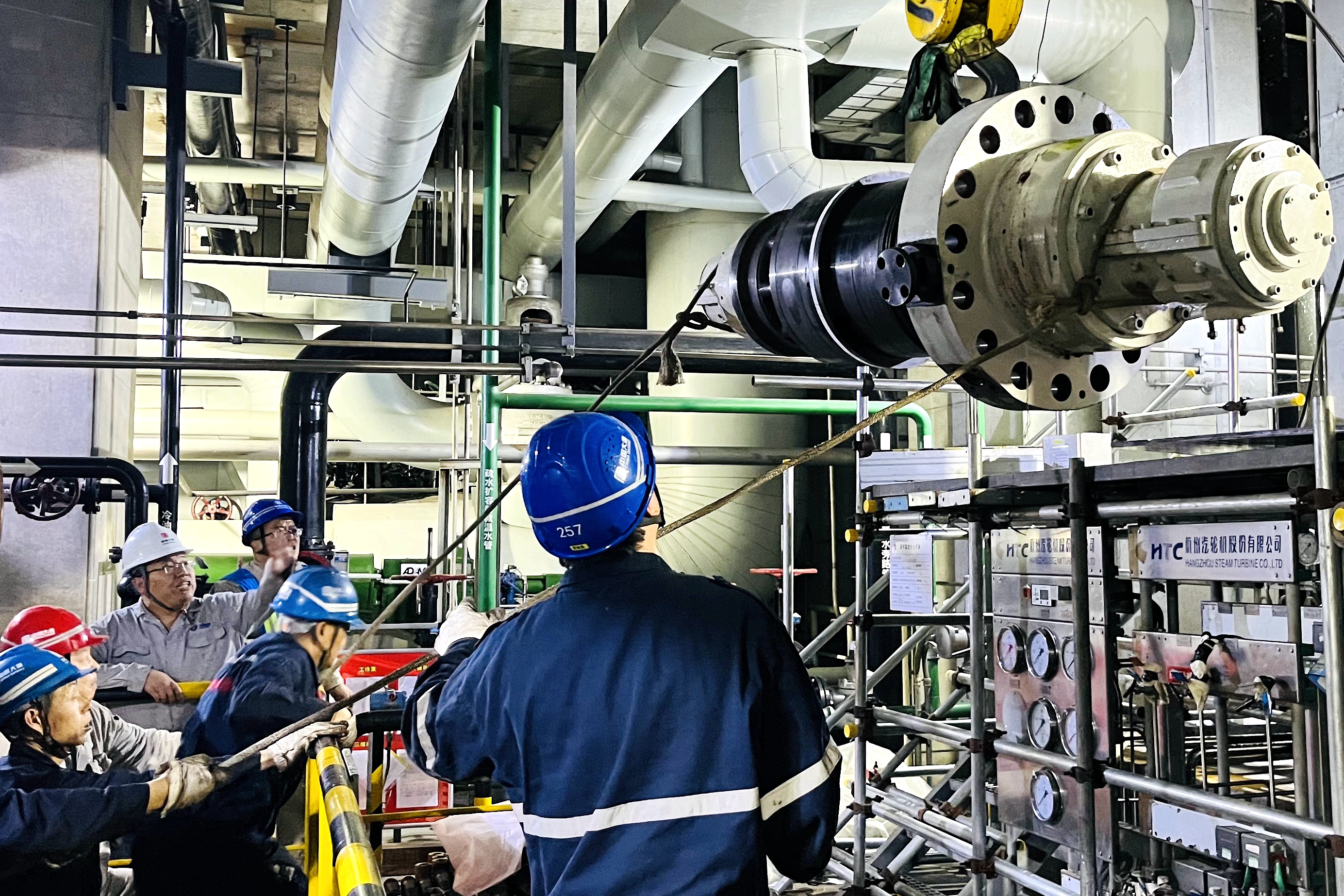 下午3点,2号机零米给水泵处,日光顺着层间通道的高窗斜切进来。“起钩——慢着,左摆半寸!”秦岭发电公司承揽富平热电维检工作的项目部汽机专工李强攥着对讲机的指节泛白,安全帽檐下的眼睛紧盯着半悬的给水泵芯包。起重工武强握着吊机操作杆,指腹贴在按钮上缓着劲:“收到,摆幅控制住了。”这庞然大物裹着刚检修完的金属冷光,已吊至泵体上方,正等着“登堂入室”严丝无缝嵌进泵体里。