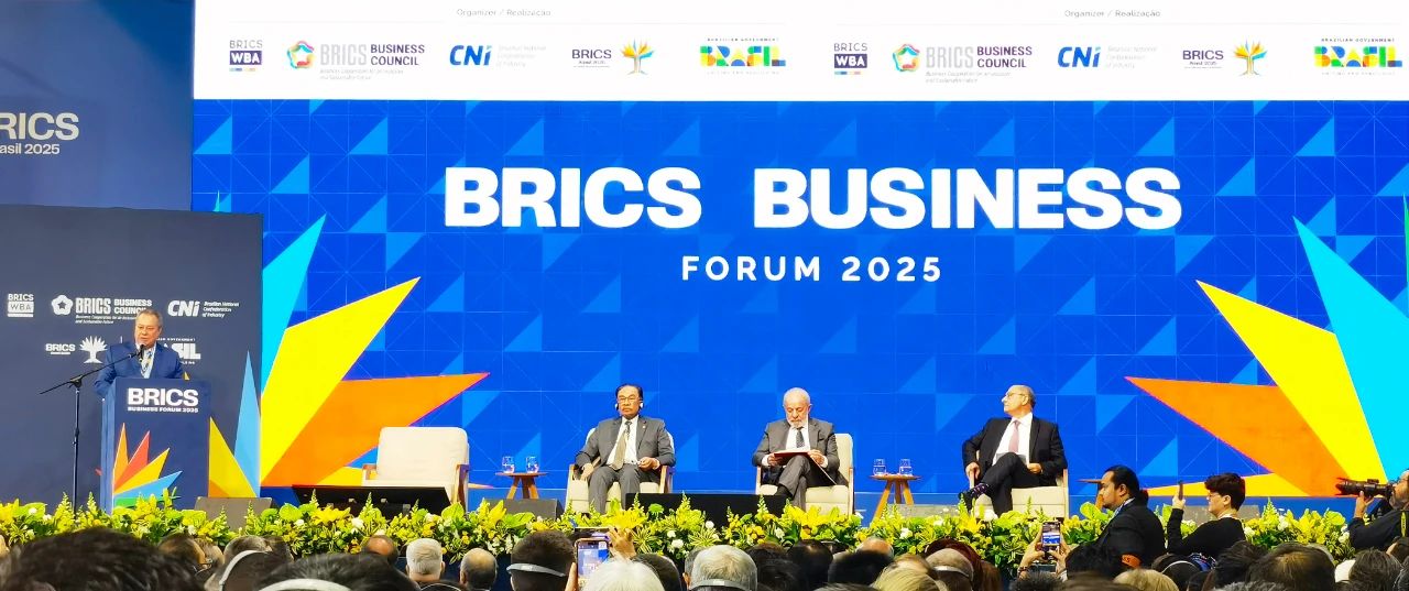 本网讯 7月5日,2025年金砖国家工商论坛在巴西里约热内卢举行。论坛围绕推动“大金砖合作”,就金砖国家经济可持续发展、粮食安全、能源转型、数字经济等一系列议题进行讨论。巴西总统卢拉出席开幕式并致辞,来自金砖国家的政府官员、企业代表、学者、智库专家和国际组织代表参会。金砖国家工商理事会中方理事,PA视讯集团有限公司党组书记、董事长吕军受邀出席论坛开幕式,以及金砖国家工商理事会年度会议、金砖国家工商理事会中方理事会会议等相关活动,并与巴西国家电力公司执行副总裁罗布森·坎波斯举行会谈。