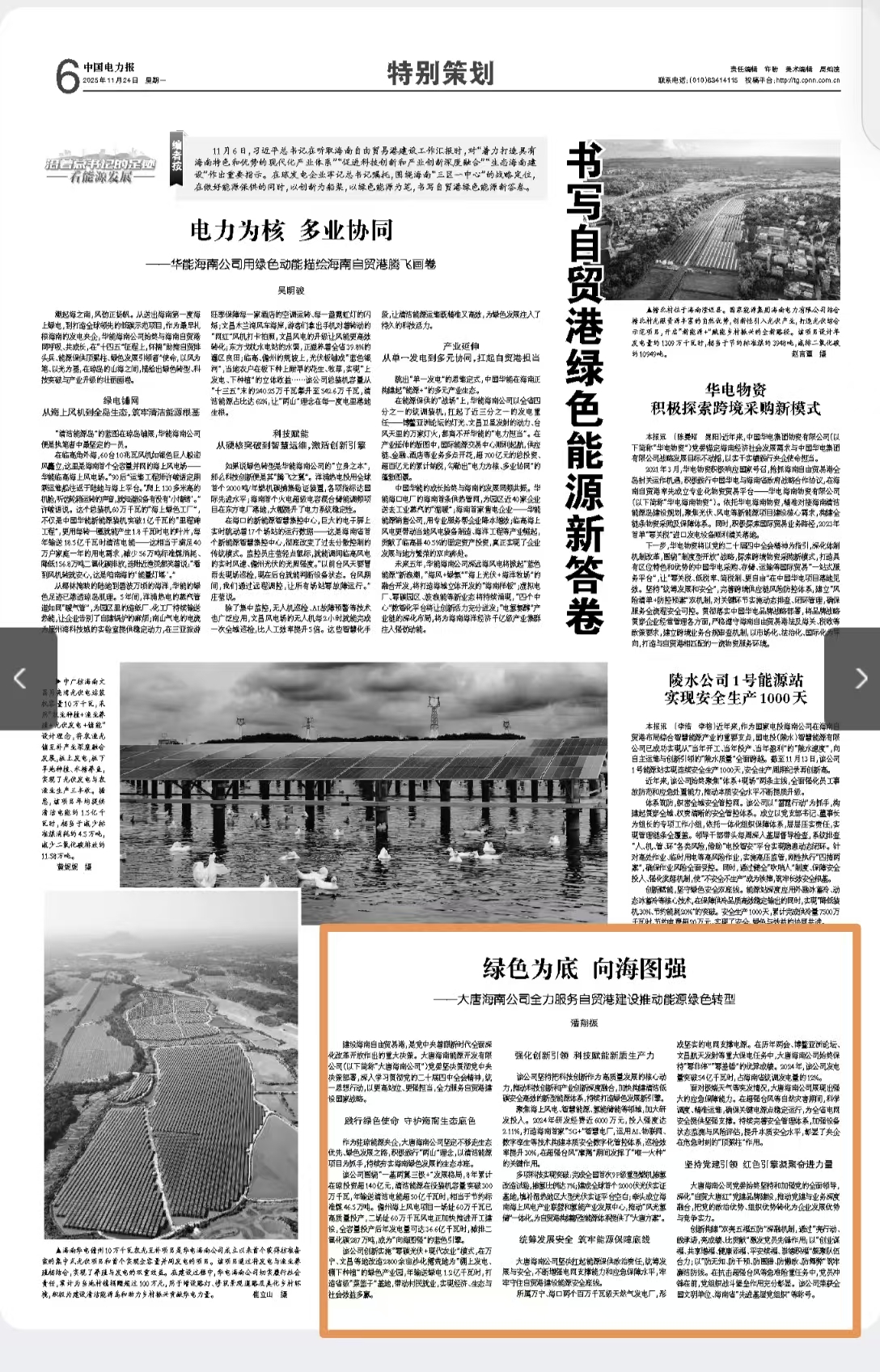 [中国电力报]2025-11-24 绿色为底 向海图强 ——大唐海南公司全力服务自贸港建设推动能源绿色转型
