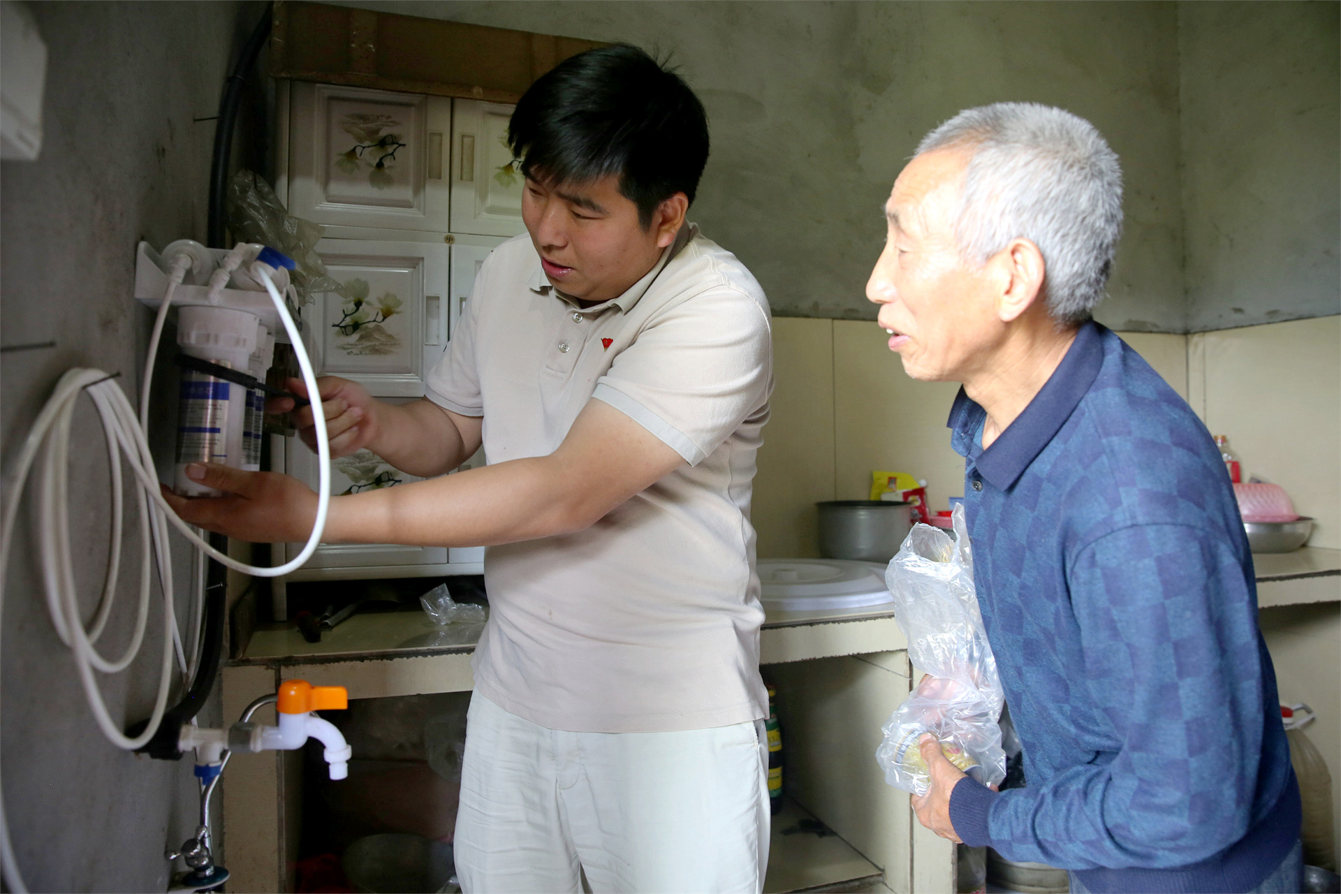方名兴带好工具赶到老刘家,一边熟练地安装新滤芯,一边教授更换滤芯的方法:“先拧开过滤器出水口的这个白色接头,取出旧的滤芯。看嘛,这个pp棉滤芯使用时间一长,过滤出来的脏东西就把出水口堵住了。把旧滤芯换为新滤芯,然后拧好接头,再插上软管就可以了。”