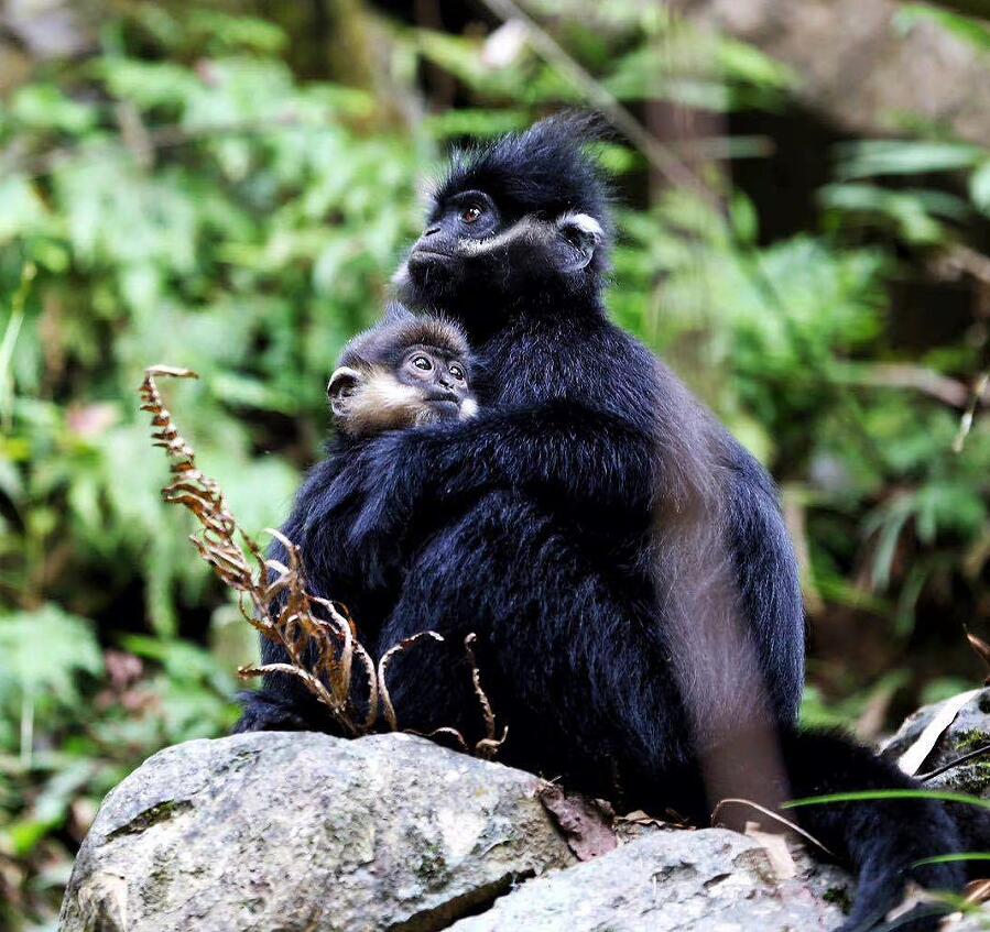 经过长途奔波,快艇行驶到贵州省沿河县境内的“麻阳河国家级自然保护区”。山上传来各种表达不同“情绪”的叫声,在生态环保专业岗位奋斗8年之久的饶振祺朝密林中一指:“快看,那就是黑叶猴!发出‘嘎,嘎’的叫声,说明它们处在愉快的觅食状态中;‘噢、噢’就是它们在山林间攀援前进的信号。”抬眼望去,岩石间、树荫深处不断有黑叶猴迅捷地跳跃。它们头顶冠毛蓬松,通体黑色,两颊雪白的“络腮胡”格外醒目,看起来像银须飘飘的“小老头”。有的黑叶猴怀里还抱着“金宝宝”——幼猴毛色金黄,随年龄增大变黑。