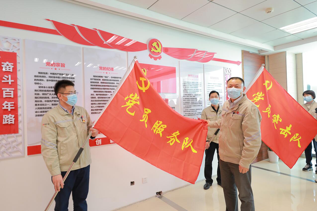 为第一党支部党员突击队、党员服务队授旗(林以恒/摄)